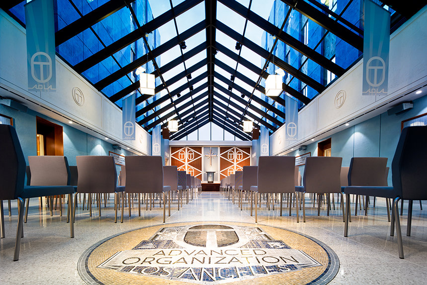 Across L. Ron Hubbard Way, at the figurative top of the Ideal Pacifica Bridge, stands the new Model Ideal Advanced Organisation of Los Angeles (AOLA). It is here Scientologists embark on their journey to OT and higher states of spiritual awareness. To that end, AOLA boasts expanded course rooms for hundreds of Solo Auditors-in-training; a Solo Technical Division exclusively devoted to Solo Auditors on Advanced Courses; and three full Hubbard Guidance Centres for those traversing the upper realms with Audited New Era Dianetics for OTs.