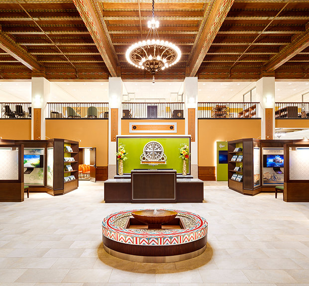 The magnificently restored facility, built in 1926, is a city landmark and registered heritage site of national significance. American Beaux Arts design to the core, its grand symmetrical exterior is typical of cornerstone early 19th-century buildings that still define American cities today. The centerpiece is without question the soaring two-story ground floor lobby, adorned with five unique types of marble, a beamed ceiling hand painted in Aztec-inspired design and chandeliers of massive proportions forged in brass and wrought iron—it’s a spectacular welcome to a Church entirely dedicated to uplifting its community.